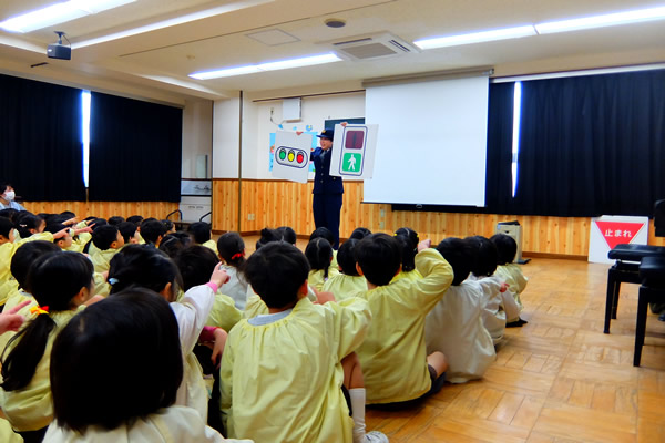 立川警察署より交通課の方々に来て頂き、子ども達に交通安全についてお話しがありました。