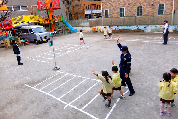 最後に年長児は春からの小学校への通学にむけて、園庭で実際に横断歩道を渡る練習を行いました。