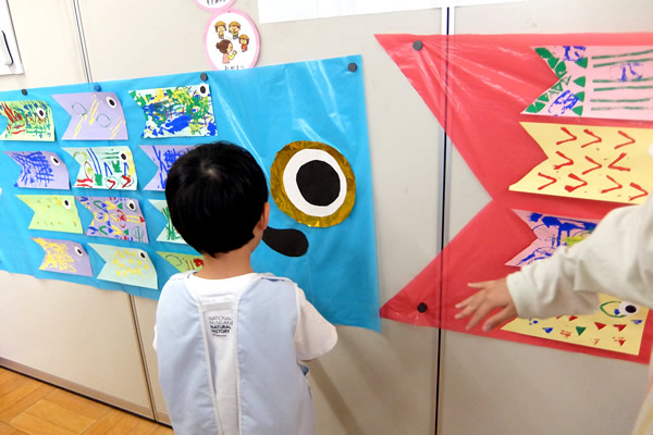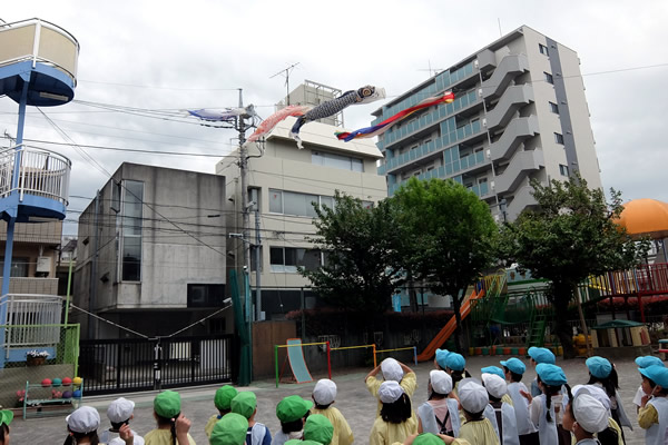 また、幼稚園では園庭に大きな鯉のぼりを泳がせました。