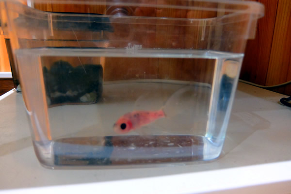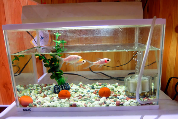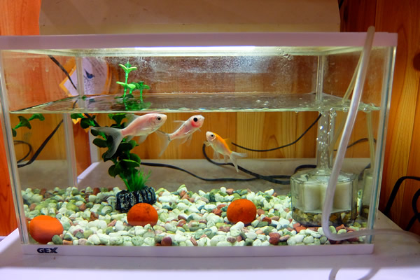 金魚やセキセイインコなどの生き物とのふれあいが11月でちょうど一年たちました。11月中旬、数人の子ども達と先生で水槽を眺め、図鑑を手にして話していました。一匹の白い金魚(しずくちゃん)が時折沈んでいく…餌を食べない、元気がないとの事。子ども達と調べた結果、別の水槽に移し塩水浴をすることで様子を見ることになりました。毎日子ども達は観察しているため早めに気づけ「どうしよう」と相談…命の大切さを感じているようです。2.3週間後に元気になったので、大きな水槽に戻し、元気に泳いでいて一安心です!
