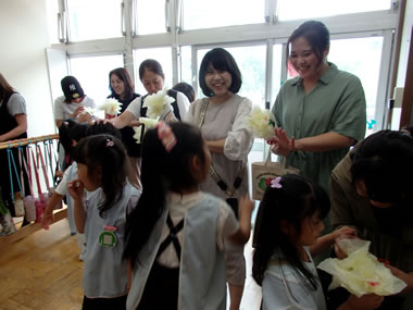 ファミリーデーの製作を学年で行いました。年少・年中は家族の絵、年長は花束を作りました。年長さんは、保護者会の日に直接おかあさんに花束を渡しました。喜んでくれましたよ!