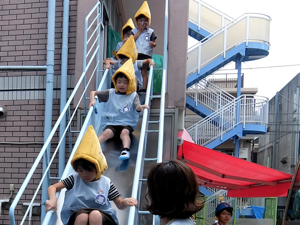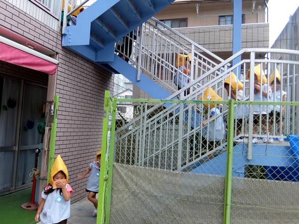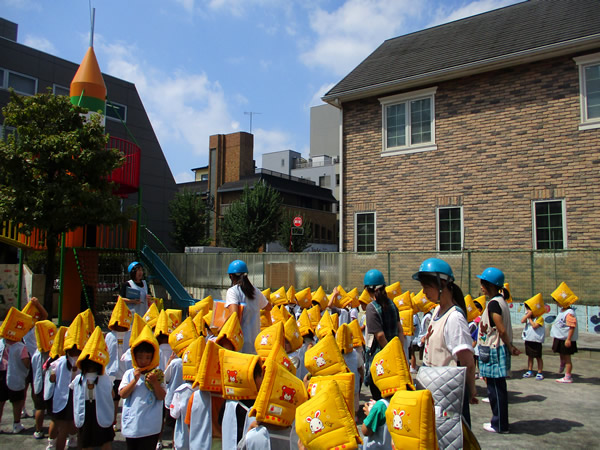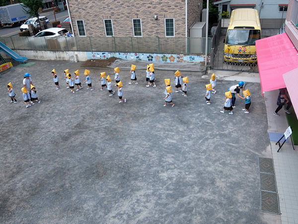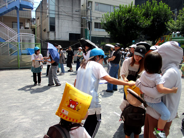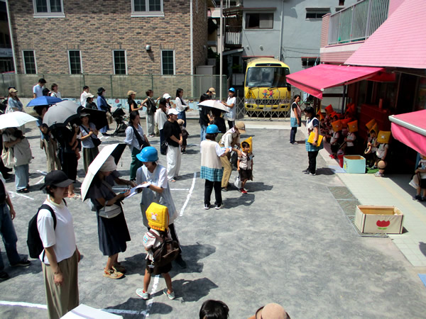 9月1日の「防災の日」に幼稚園では災害についての認識を深めるために、全園児と保護者の皆さんで「防災引取訓練」を行いました。非常時も落ち着いて行動することを学んでもらい、保護者の方には「緊急時の流れ」を確認してもらいました。 大変暑い中、ご協力頂きありがとうございました。