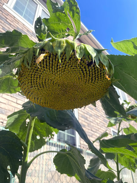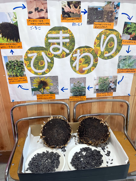 種植えから大切に育ててきた「ひまわり」の花も、秋の訪れとともに頭を垂れてお休みしていきました。「お花は咲いたあと、次の種や実を残すために、