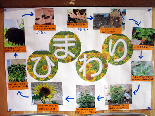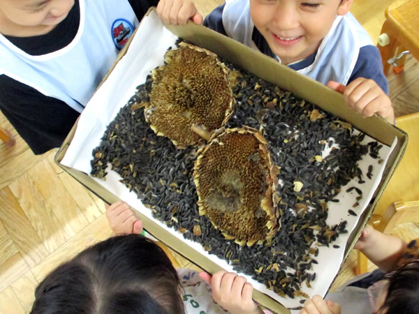 ※幼稚園で採集した種は、福島県復興を支援する「ひまわりプロジェクト」に送ります。このプロジェクトでは集まった種から「ひまわりオイル」を製造