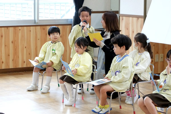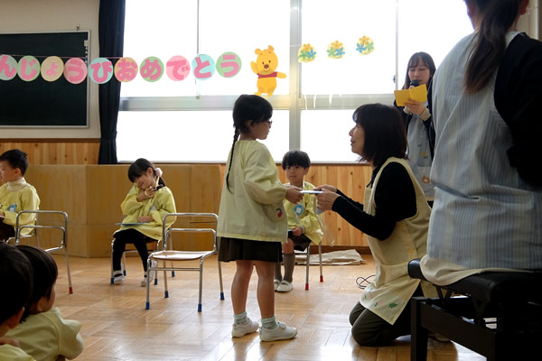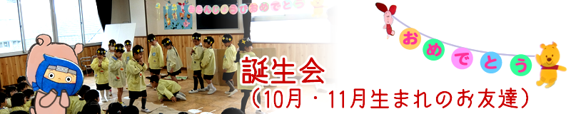 今年度4回目の誕生会を開催しました。誕生児の保護者の方(1名)をお招きして誕生会を見学して頂き、お子さんの成長を一緒に祝っていただきました。子ども達は嬉しさと恥ずかしさで前に出てかっこいい姿や緊張した姿をみせていました。インタビューで誕生日を発表し、大きくなったらなりたいものを紹介してくれました。