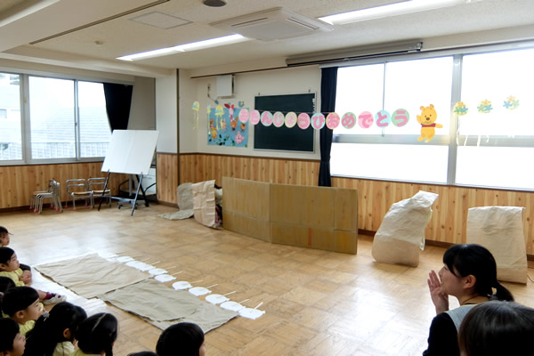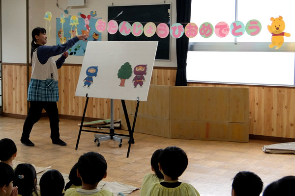 先生の出し物は、『にんにん忍者の発表会』というパネルシアターを観ました。修業中のにん太郎が忍術を発表していますが・・・、どれも上手くいかずまだまだ修行が必要というお話でした。