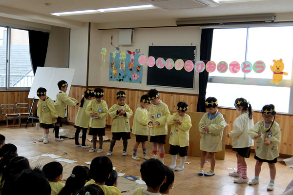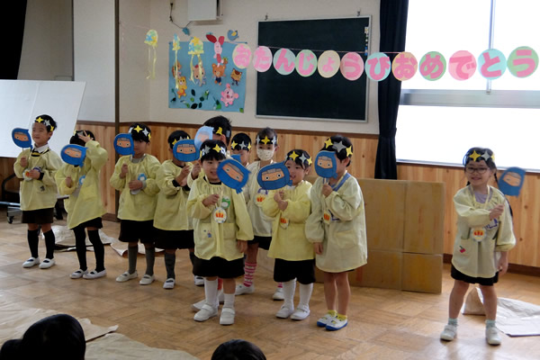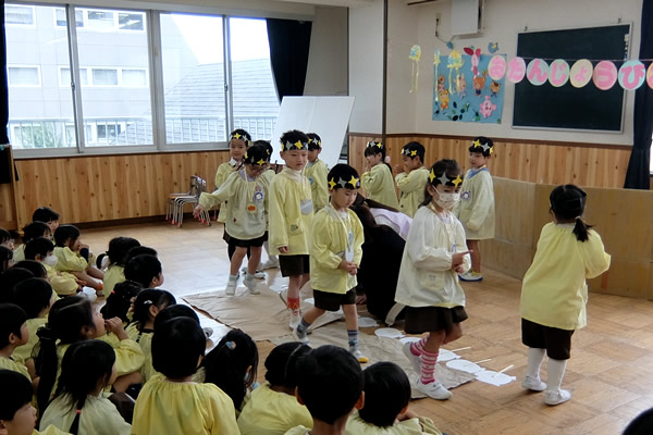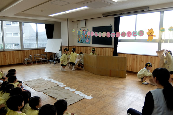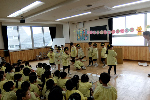その後に、多摩幼稚園で忍術を練習していたお友達(お誕生日の子ども達)も忍術を披露してくれています。こちらは、緊張しながらもなりきって発表をして観ている皆やお誕生日の子どものお母さん・お父さんも楽しんでいましたよ。