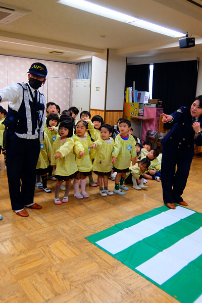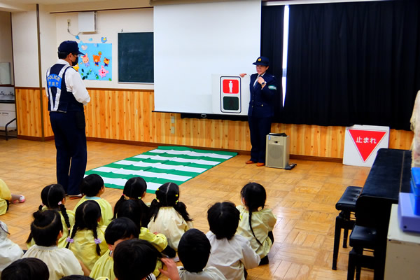 立川警察署より交通課の方々に来て頂き、子ども達に交通安全についてお話しがありました。