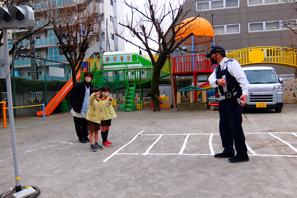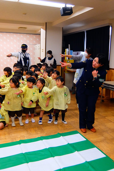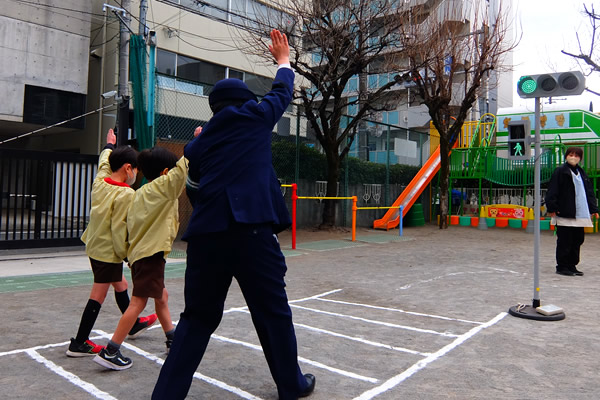 最後に年長児は春からの小学校への通学にむけて、園庭で実際に横断歩道を渡る練習を行いました。