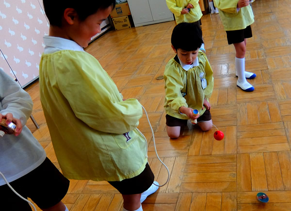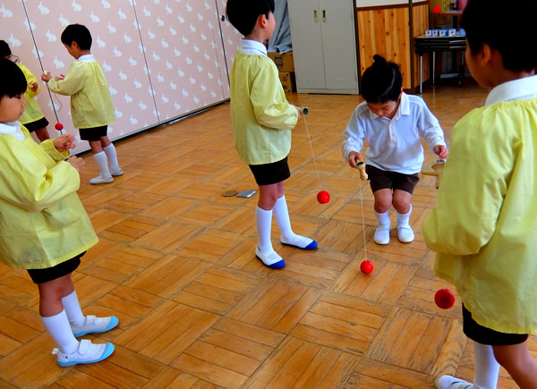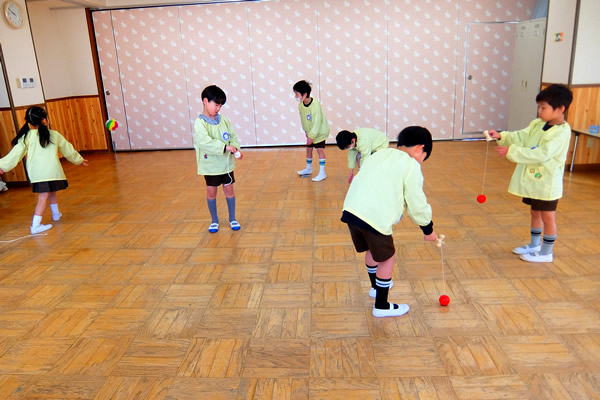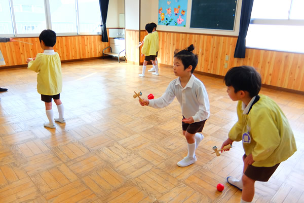 新年を迎え朝の自由遊びの時間に、年長児は羽子板・ヨーヨー・木芯コマ(ひも付き)・けん玉をホールにて楽しんでいます。上記の遊具に油性ペンで模様付けを先に行いました。カラフルに色塗りや模様を描き、中にはお正月らしい模様も描かれていて「さすが年長さん」です。まだまだ遊びこむには難しく、練習の日々ですが楽しみながら頑張っていますよ‼