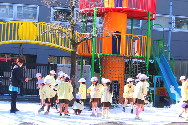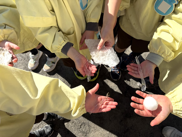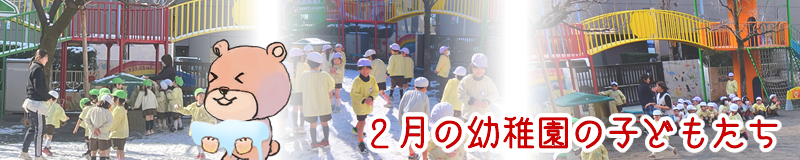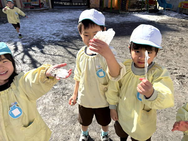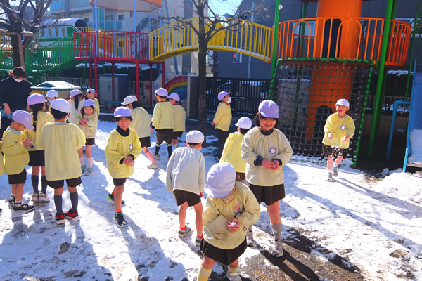 立春を迎えてもなお、冷たい空気に包まれる日が続いていた2月上旬に雪が降りました!降り積もった雪を見つけて大喜びする子どもたちは、さっそく雪遊び!「冷たい」と雪を手にして楽しんでいましたよ (*⌒∇⌒*) 数日後天気は一転、園庭ではマラソンで体力作りの子どもたち!!「頑張るぞ」と意気込んでいる可愛い姿を見て、写真を撮りながら応援しました p(^-^)q 子どもたちが元気に冬ならではの遊びや活動を楽しんでいる様子です‼