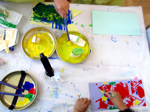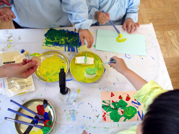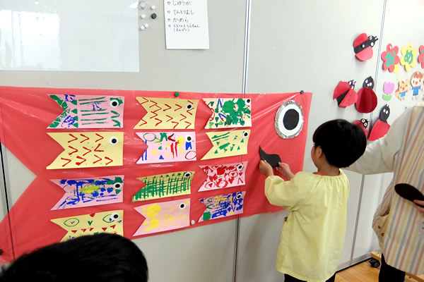 4月「第1回目の縦割り保育」の一つのコーナーで、鯉のぼりのうろことなる「小さい鯉のぼり」にスタンピングをして模様を描きました!