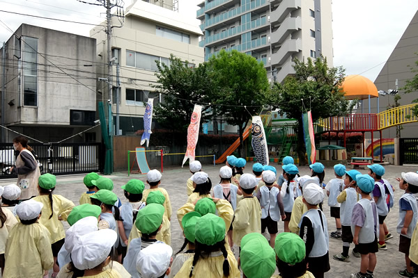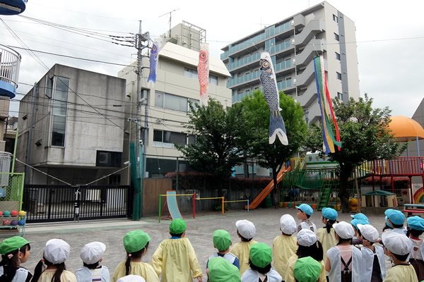 また、幼稚園では園庭に大きな鯉のぼりを泳がせました。