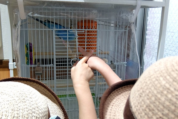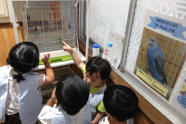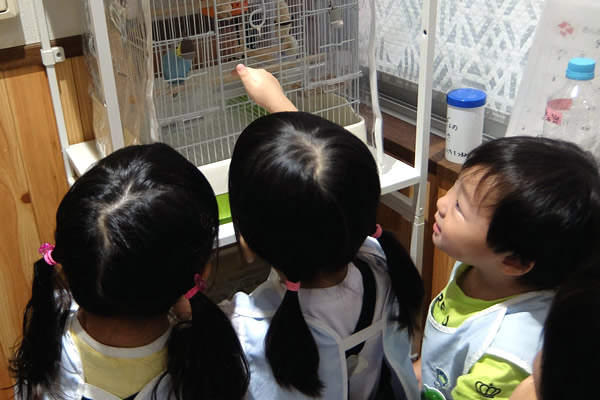 休み明けにピーちゃんがいないと寂しがっていた子ども達。久しぶりの再会に大喜び!ピーちゃんも大きな声で鳴いていて、子ども達はたくさん話しかけていましたよ。