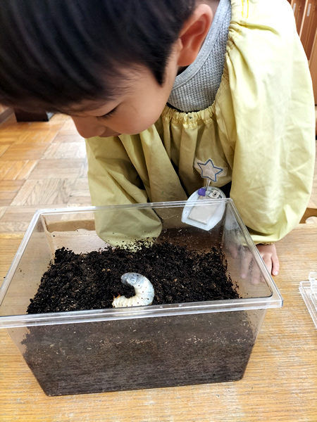 よーく観察したら、「幼虫さん土の中へ戻ろうね」