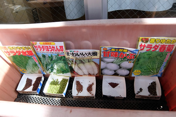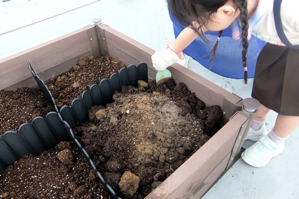 さあ暑い中、土を入れ、肥料を混ぜ、翌週に種をうえましたよ。種はサラダ水菜・かわいい大根・サラダほうれん草・甘味かぶ・サラダ春菊の5種類です。これから、朝・帰りの水やりや観察を頑張りましょう!