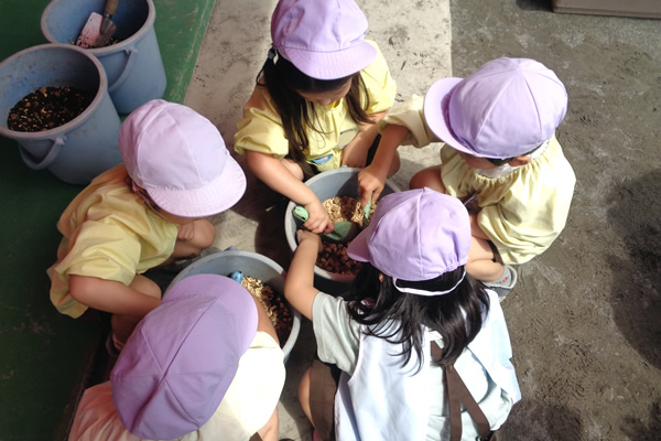 幼稚園の畑で育てたブロッコリーを年中さんが収穫して食べました。