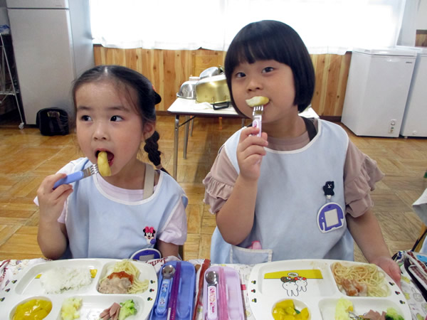 給食の時間にみんなで「おいしー!」「おかわりー!」と味わいました。季節の食物から秋を感じる一日となりました。