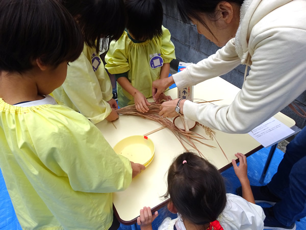 みんなで育てたお米を年長さんが代表して脱穀しました。ほんのわずかの量ですが、お母さん達に手伝っていただき、乾燥させた稲の穂先からもみをとる作業(脱穀)ともみすり(玄米にする)を行いました。