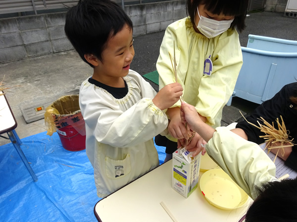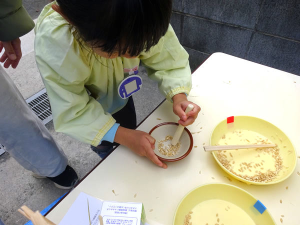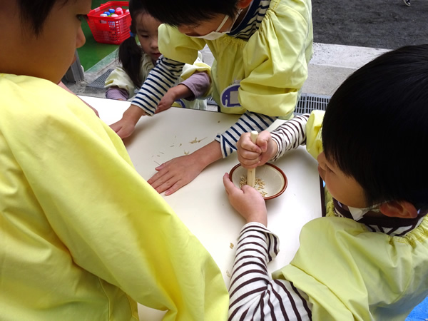 お友達と協力をしてお米を一粒ずつにしているよ。