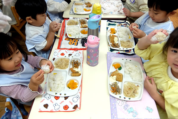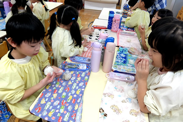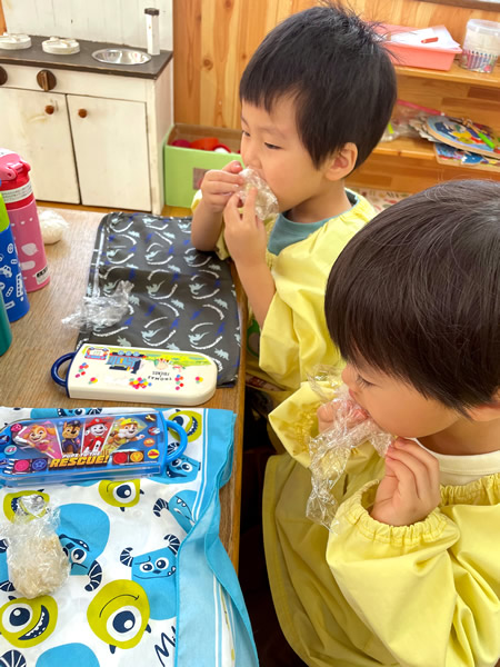 翌週に、その玄米を使っておにぎり作りを楽しみました。購入した玄米と混ぜて「玄米おにぎり」、そしていつも食べている「白米のおにぎり」も作りました。炊き立ての香りが園内に広がり、熱々をにぎりながら思い思いのおにぎりを作りました。おかわりを作る子もたくさんいて、お腹いっぱいの一日となりました。