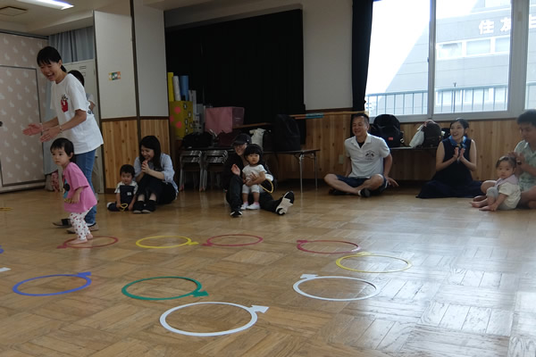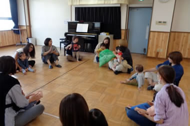 TAMAクラブさんを中心に、未就児の皆さんと一緒にリトミックを楽しみました。講師の根岸先生が今回も指導していただき、小さなペットボトルとお豆でマラカスを作り親子でリズムにあわせています。・・・・