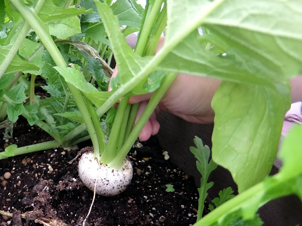 屋上で育てた冬野菜を親子で収穫して、包丁で切りました・・・・